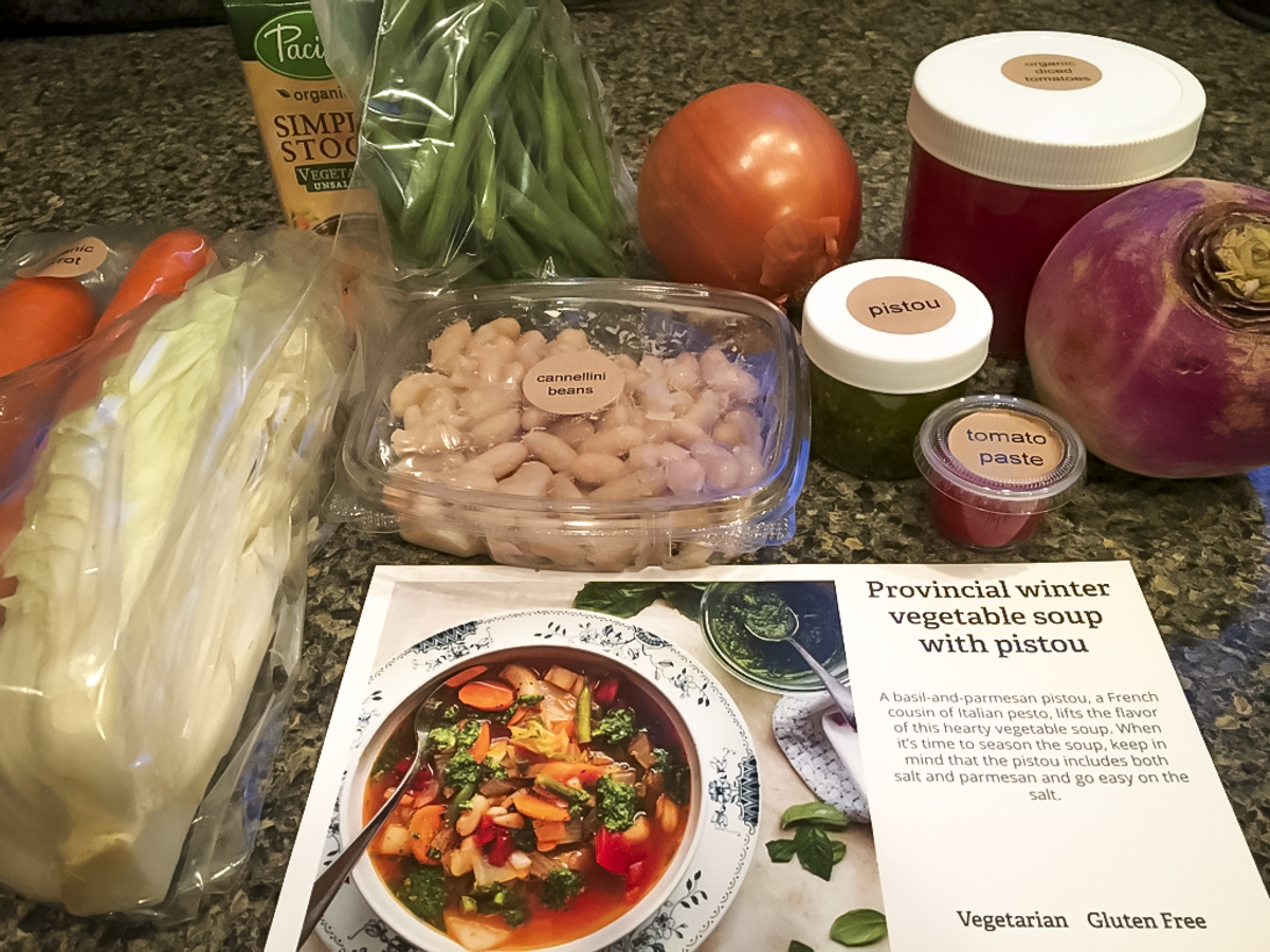 I decided to cook up the Provincial Winter Vegetable Soup with Pistou first [click the link for the recipe and a pretty picture]. Besides the freshness of the vegetables, the thing that struck me was the quantity of food. Sun Basket sent us the two serving plan, but there was enough food to feed three of us plus leftovers. Most importantly, it was delicious!